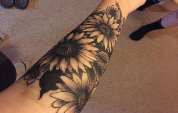 手臂上黑白纹身点刺技巧植物纹身素材向日葵纹身图片