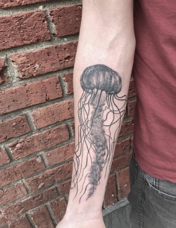 手臂上纹身黑白灰风格点刺纹身简单线条纹身水母纹身图片