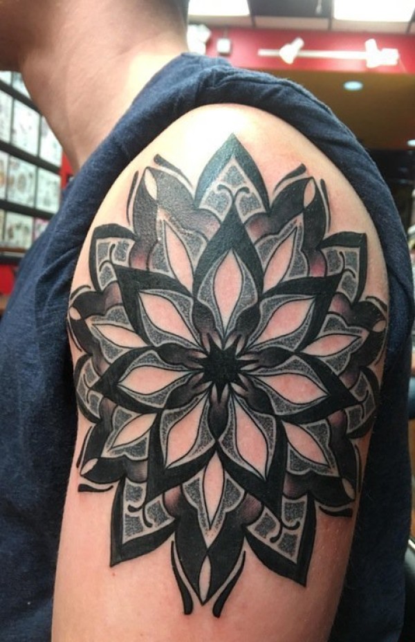 手臂上纹身黑白灰风格点刺纹身曼陀罗图案纹身图片