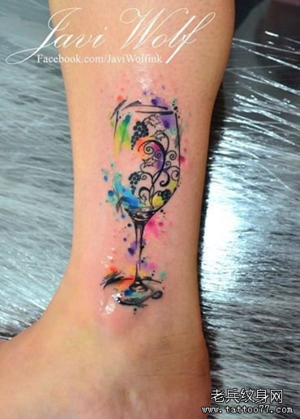 脚踝彩色泼墨酒杯藤蔓纹身图案