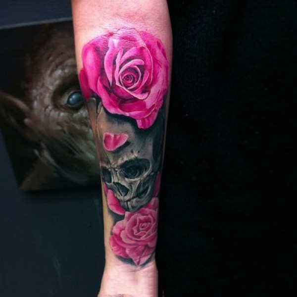 手臂美艳动人的骷髅皇后玫瑰纹身图案