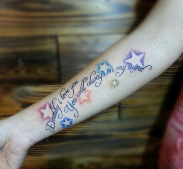小臂上彩色星星和英文字母纹身图案