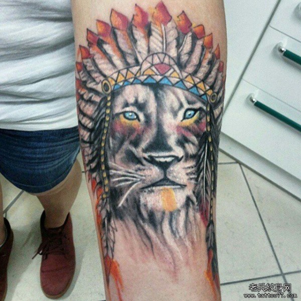 小臂印第安狮子彩色纹身图案