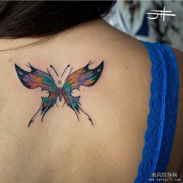 背部彩色蝴蝶纹身图案