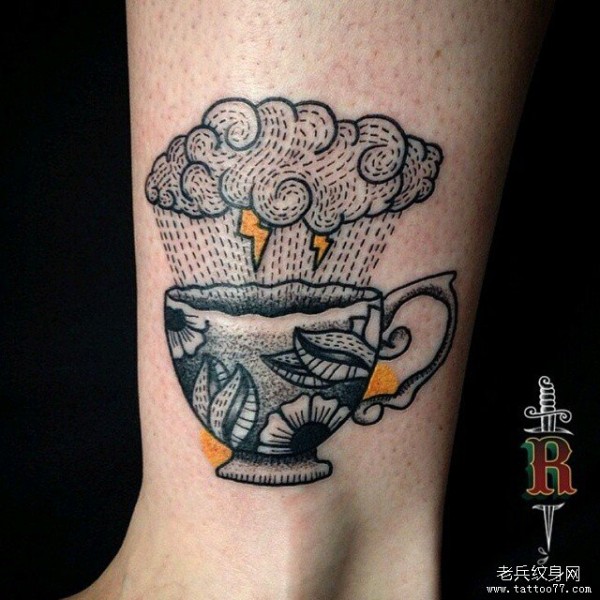 脚踝点刺茶杯云朵纹身图案