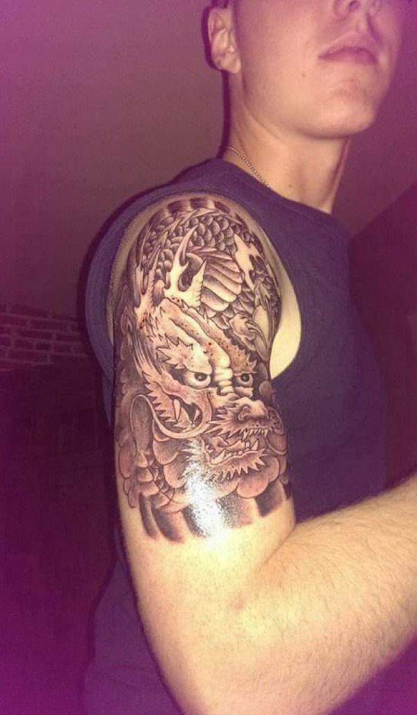男生手臂上纹身黑白灰风格点刺纹身火龙纹身动物纹身图片
