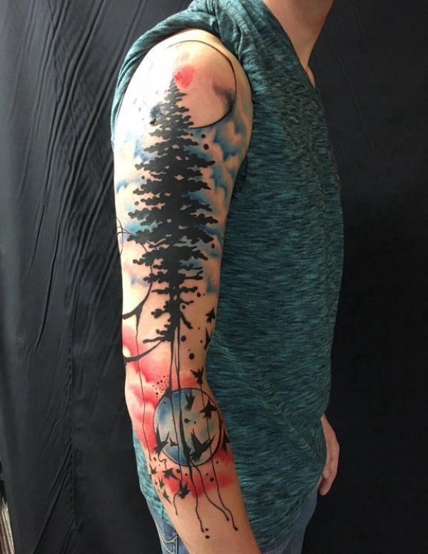手臂上彩绘纹身几何元素纹身月亮纹身和树纹身植物纹身图片