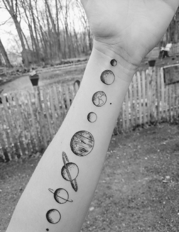 手臂上纹身黑白灰风格点刺纹身几何元素纹身小星球纹身图片