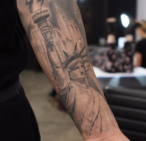 一组关于纽约城市和人物的黑白灰风格点刺纹身图案