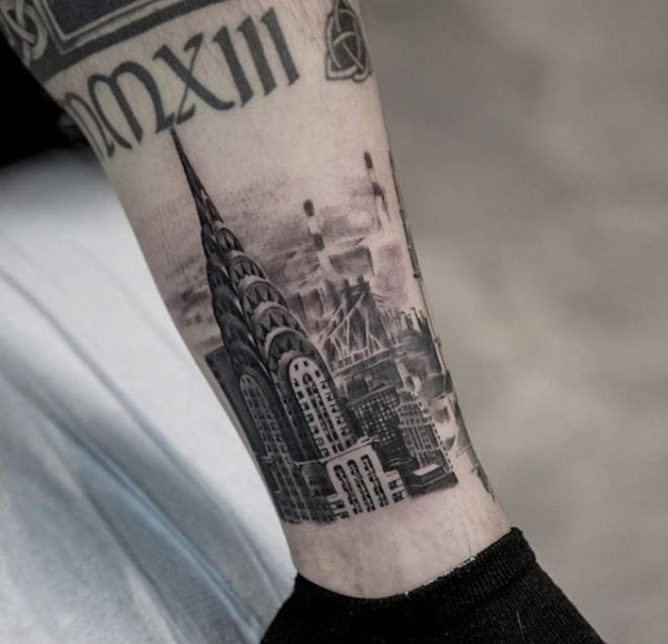 一组关于纽约城市和人物的黑白灰风格点刺纹身图案