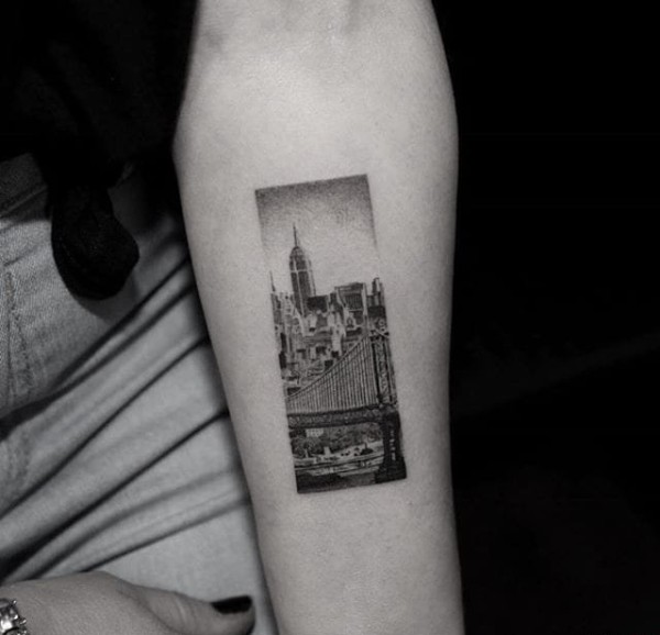 一组关于纽约城市和人物的黑白灰风格点刺纹身图案