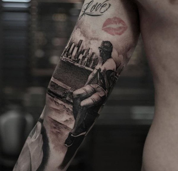 一组关于纽约城市和人物的黑白灰风格点刺纹身图案