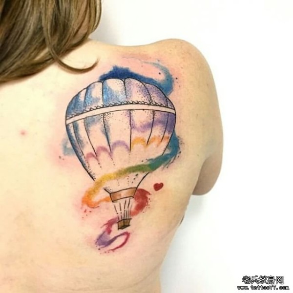 女生背部热气球泼墨彩色纹身图案