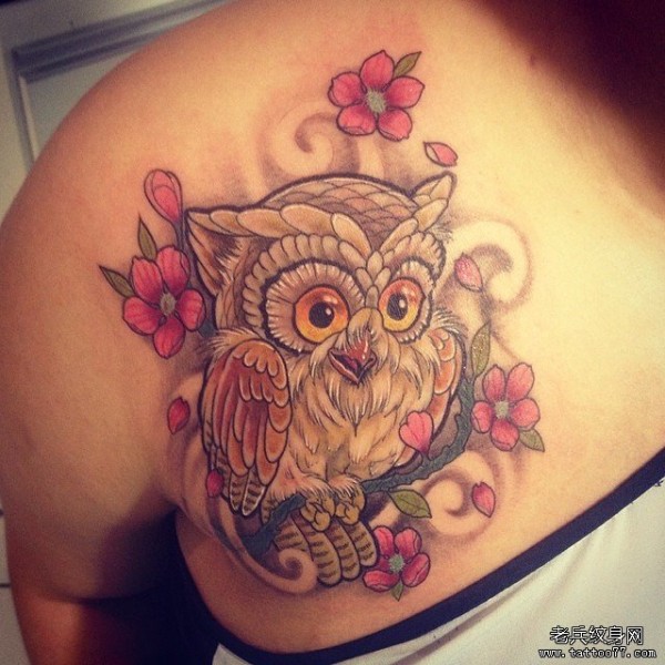 胸部猫头鹰花朵school纹身图案