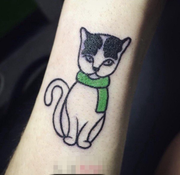 女生手臂上简单个性线条黑猫小动物纹身图片