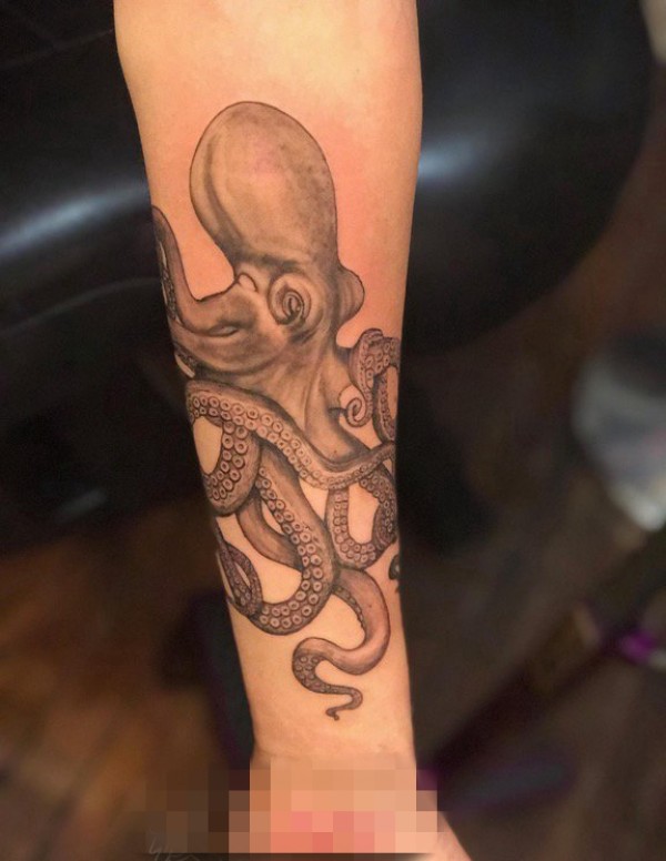 手臂黑白灰风格点刺黑色章鱼动物纹身图片