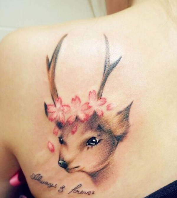 肩部唯美的小鹿花朵字母彩色纹身图案