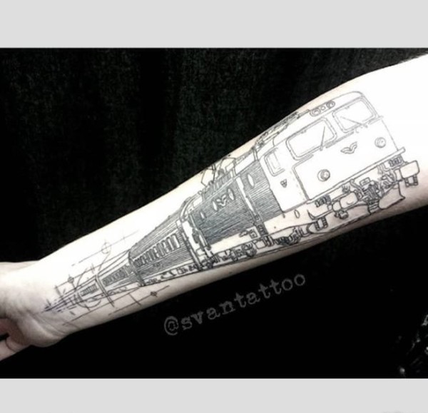 一组纹身黑白灰风格点刺技巧的火车纹身图案