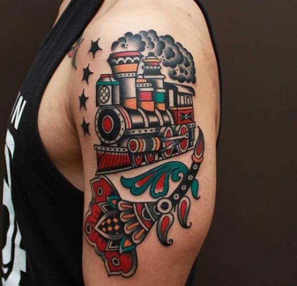 一组纹身黑白灰风格点刺技巧的火车纹身图案
