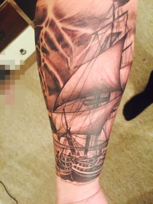 手臂黑白灰风格点刺技巧几何元素帆船纹身图片