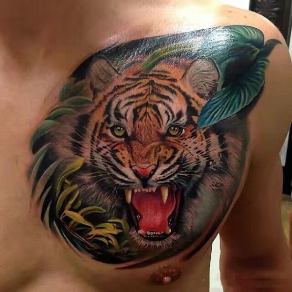 胸部写实老虎植物彩绘纹身图案