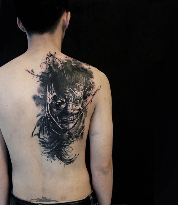 后背蝙蝠侠与小丑肖像纹身图案