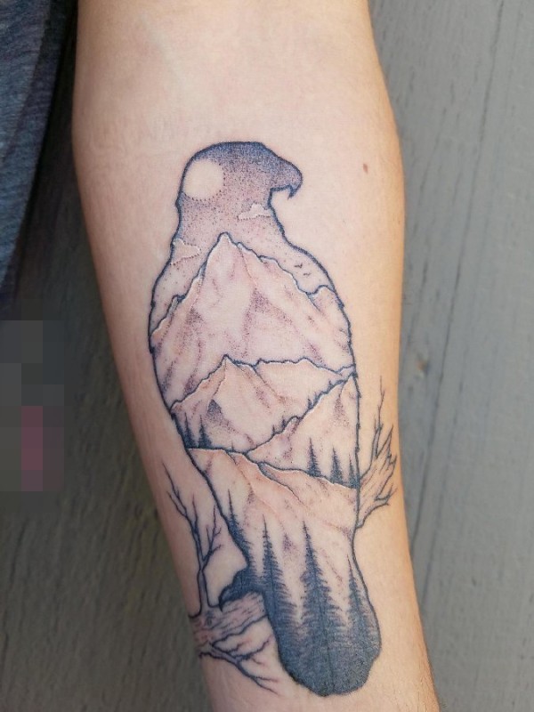 黑色手臂简单线条纹身动物鸟纹身轮廓山峰和树纹身图片