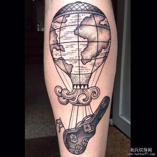 小腿热气球吉他点刺纹身图案