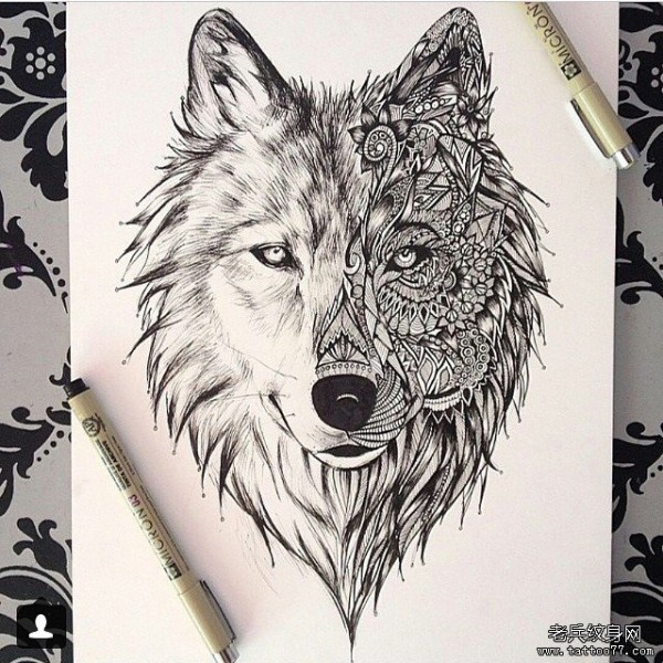 欧美狼头花卉组合欧美黑灰纹身图案手稿