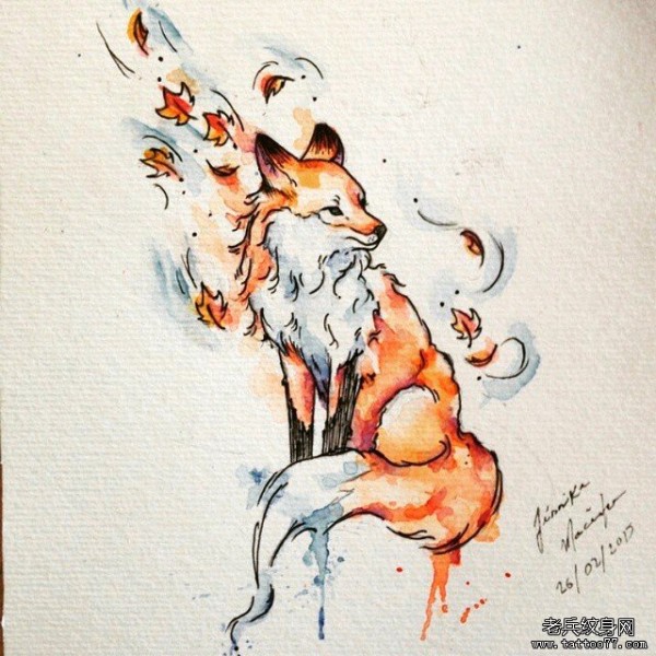 欧美泼墨彩色狐狸纹身图案手稿