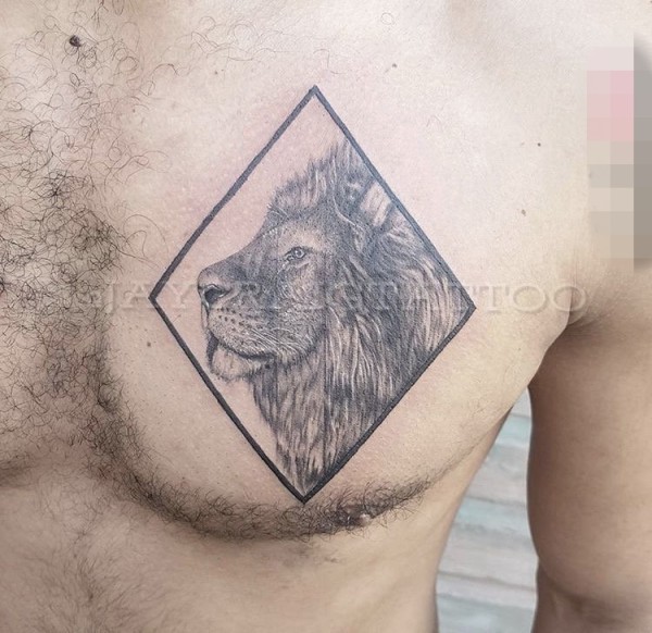 男生胸部黑白灰风格点刺技巧几何元素狮子王纹身动物图片