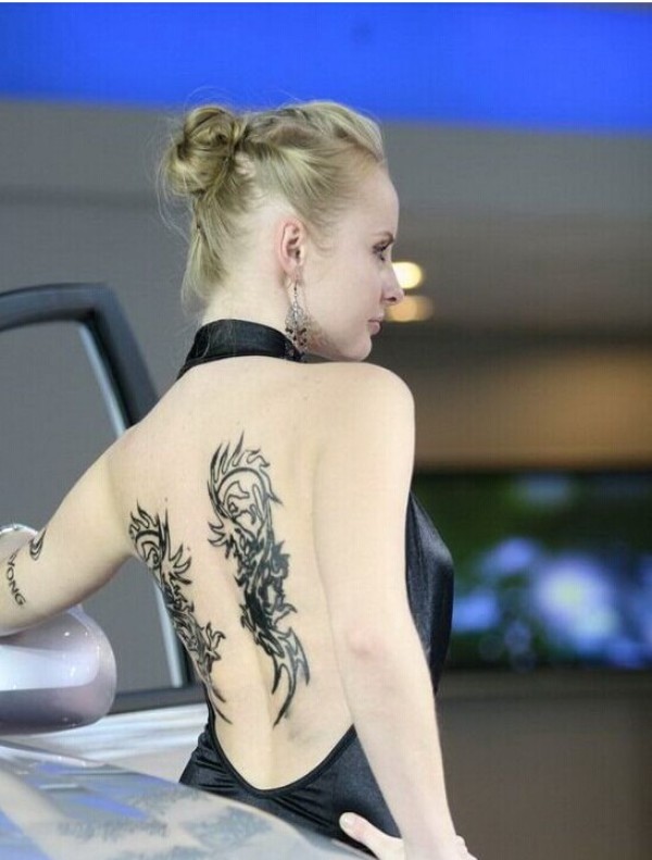 欧美美女车模后背龙图腾纹身图案