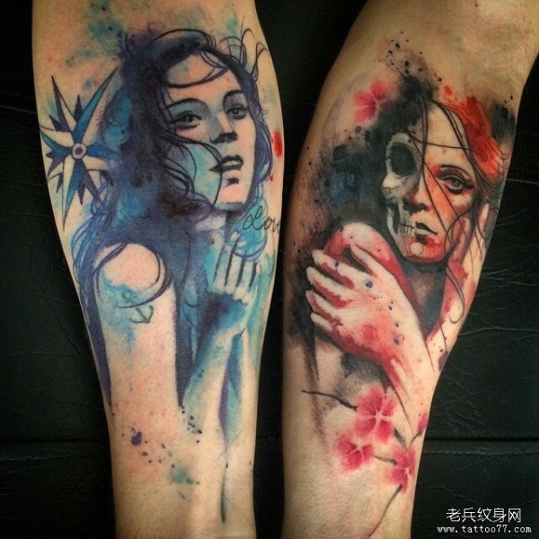 小臂泼墨女郎彩色欧美纹身图案