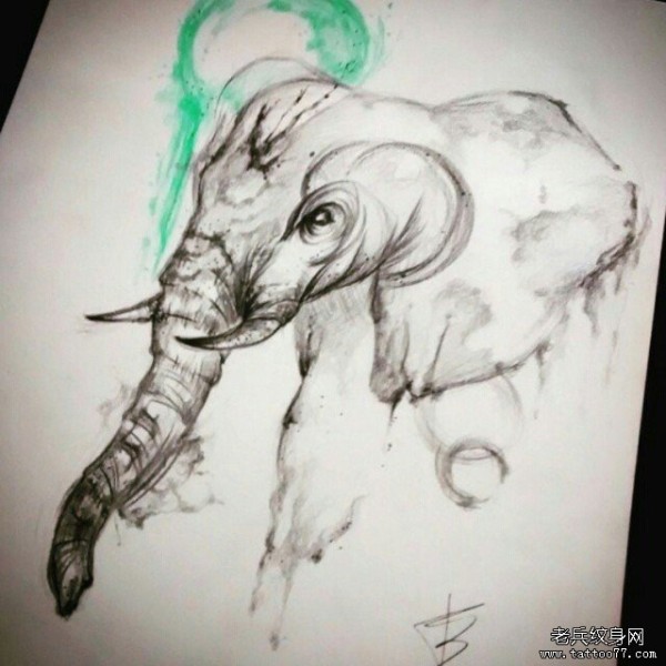 欧美黑灰素描大象纹身图案手稿