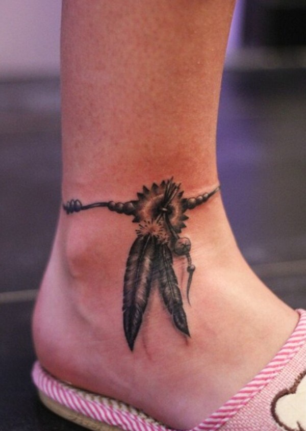 女性脚踝脚链羽毛纹身图案