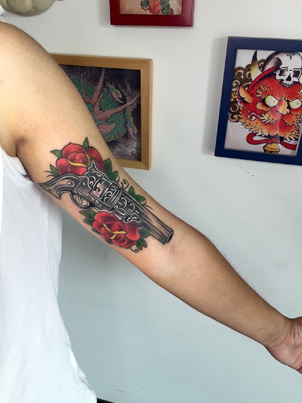 手臂手枪玫瑰彩绘纹身图案