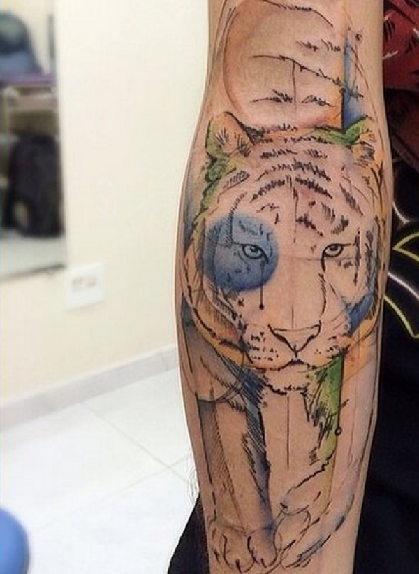 手臂水墨线条老虎纹身图案