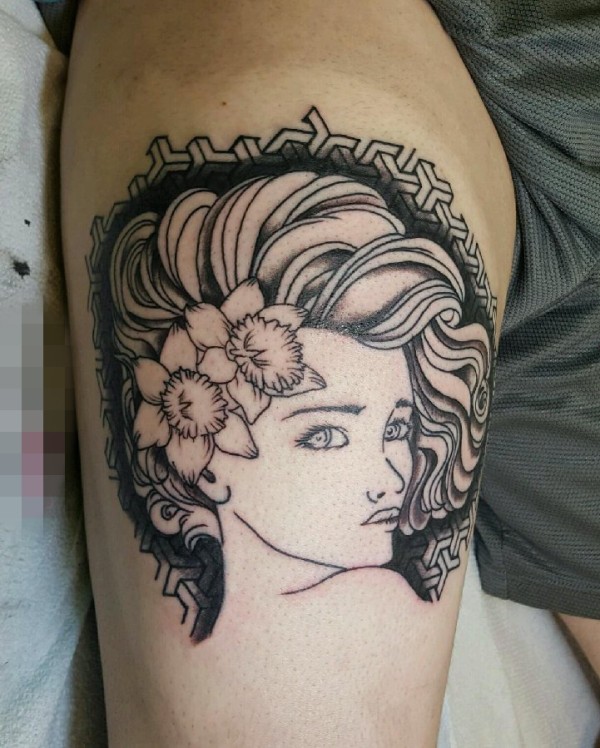 大腿上黑白灰风格点刺植物素材花朵人物肖像纹身图片
