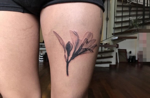 女生大腿上纹身黑白灰风格纹身点刺技巧植物纹身素材花朵纹身图片