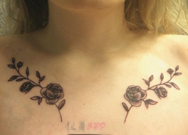 女生双肩对称黑白灰点刺植物花朵纹身图片