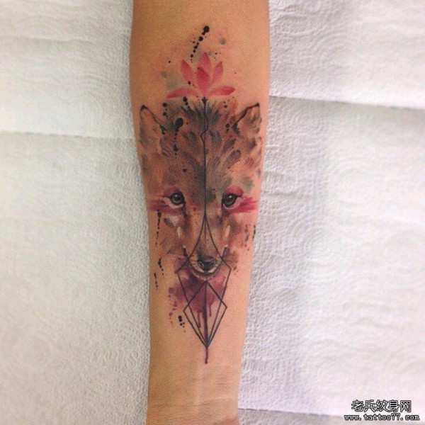 小臂泼墨可爱狼头与几何纹身图案