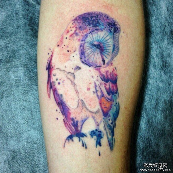 小腿泼墨彩色猫头鹰纹身图案