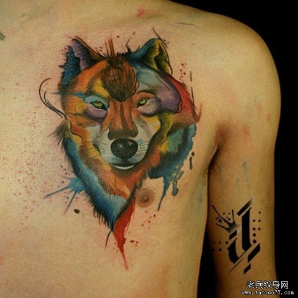 胸部欧美泼墨狼头纹身图案