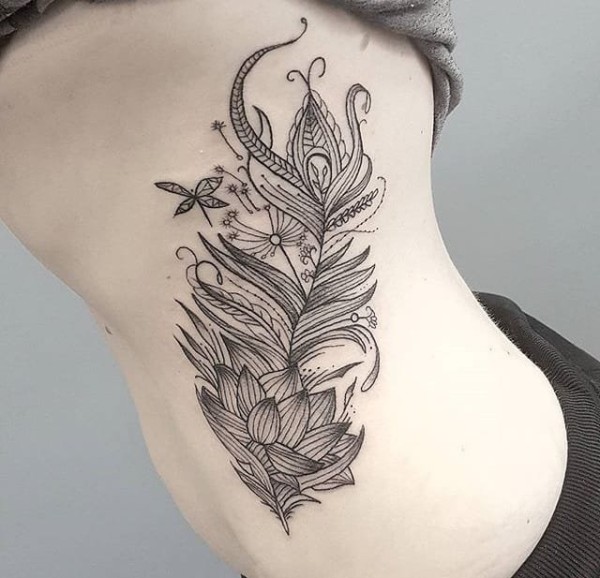 女生后腰纹身黑白灰风格抽象线条纹身图案
