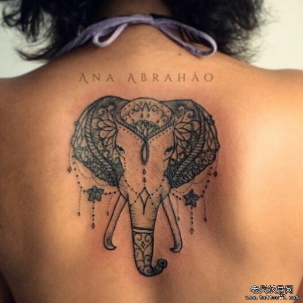 背部大象黑灰欧美纹身图案