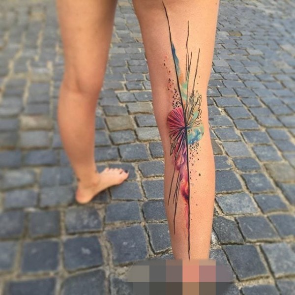 帅气的彩色花腿纹身水墨画纹身图案