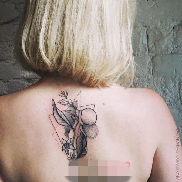 女生后腰纹身黑白灰风格抽象线条纹身图案