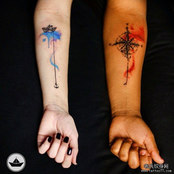 情侣手臂欧美彩色泼墨指南针船纹身图案