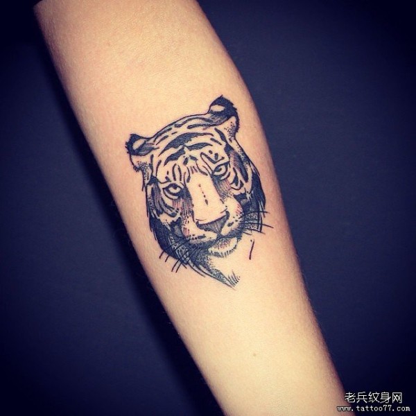 小臂黑灰欧美点刺老虎纹身图案
