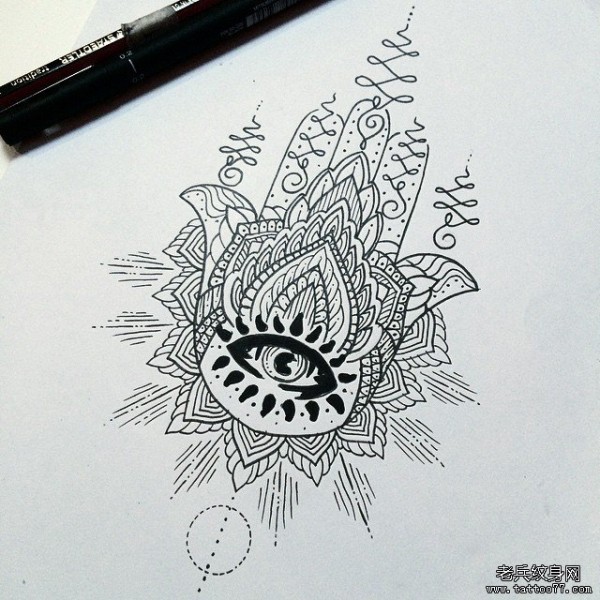 法蒂玛之手眼睛梵花线条纹身图案手稿